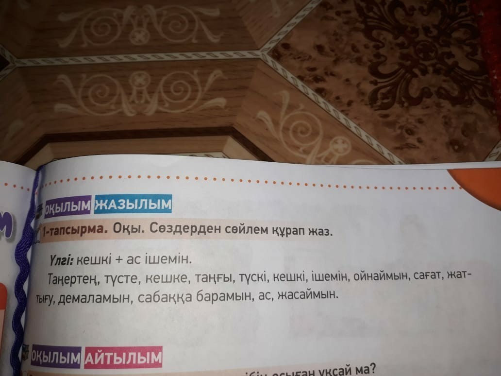 таңертең+ерте тұрамын, түсте+сабаққа барамын, кешке+ұйықтаймын, таңғы+жаттығу жасаймын, түскі+ас ішемін, кешкі+серуенге шығамын, тамақ+ішемін, далада+ойнаймын, сағатқа+қараймын, жаттығу+жасаймын, көп+демаламын, уақытылы+сабаққа барамын, кешкі+ас жасаймын