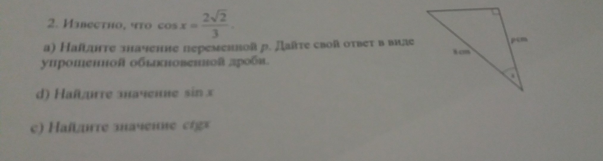 б) найдем второй катет: √(8²-((16√2)/3)²)=√(64-512/9)=√64/9=8/3