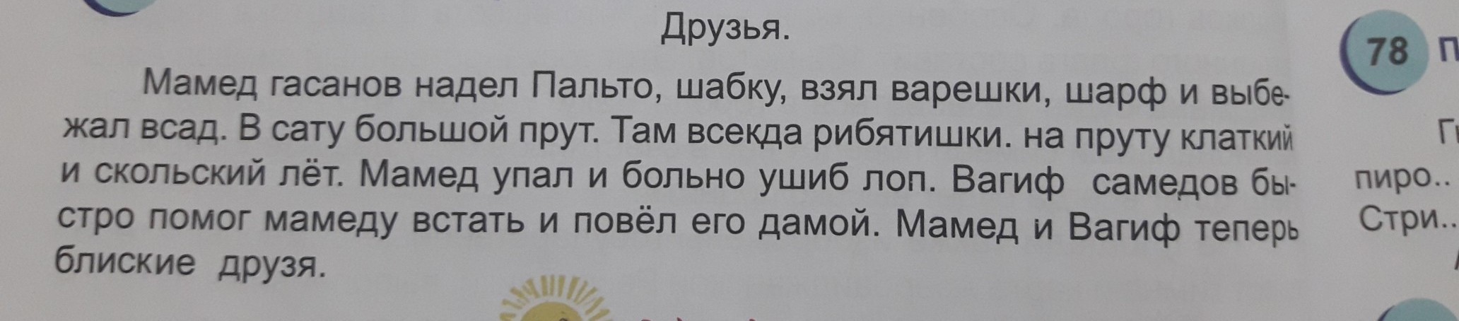 Мамед Гасанов надел пальто, шапку, взял варежки, шарф и выбежал в сад. В саду большой пруд. Там всегда ребятишки. На пруду гладкий и скользкий лёд. Мамед упал и больно ушиб лоб. Вагиф Самедов быстро помог Мамеду встать и повел его домой. Мамед и Вагиф теперь близкие друзья.