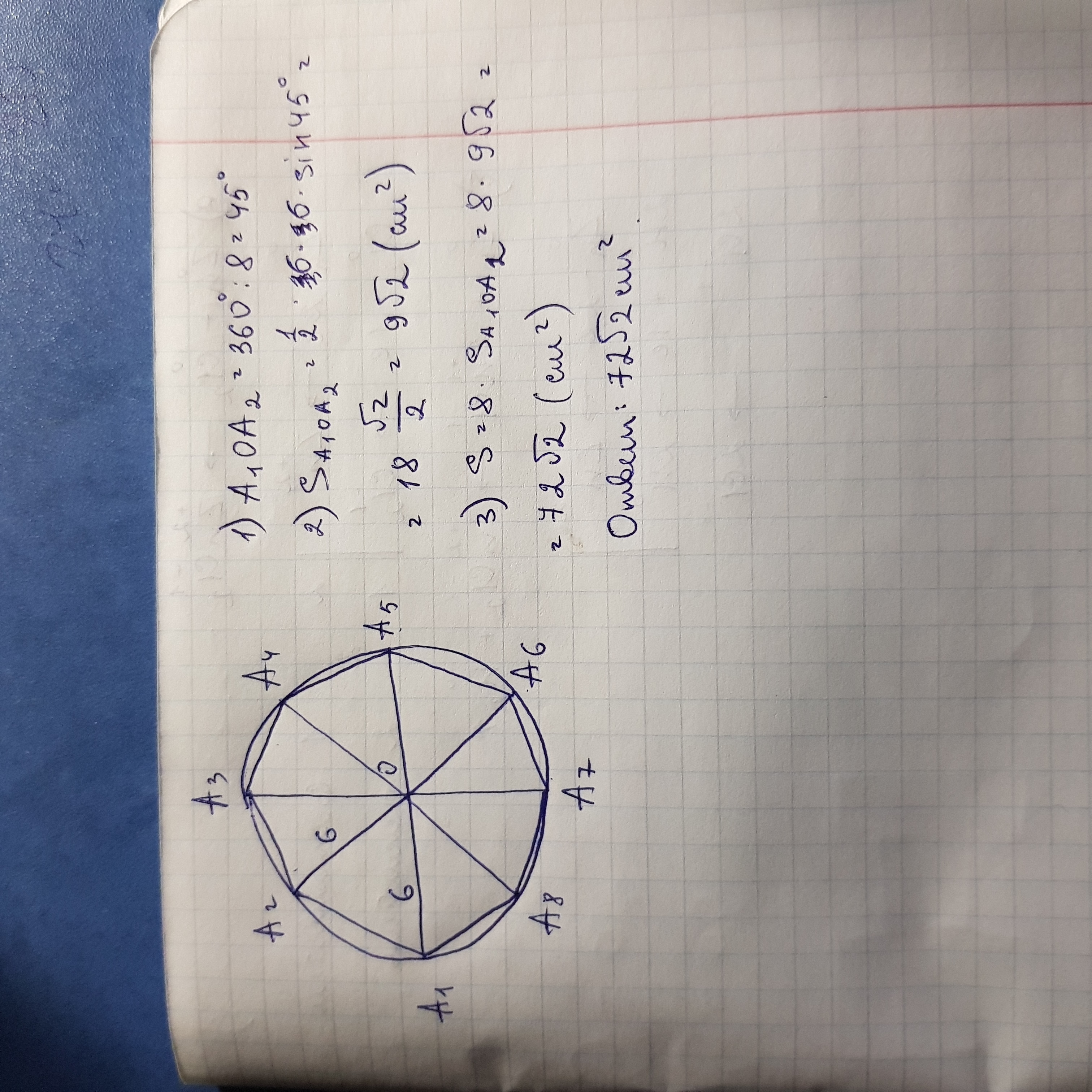 даю 17 балов.найдите площадь правильного восьмиугольника вписанного в окружность радиус которой равен 6 см