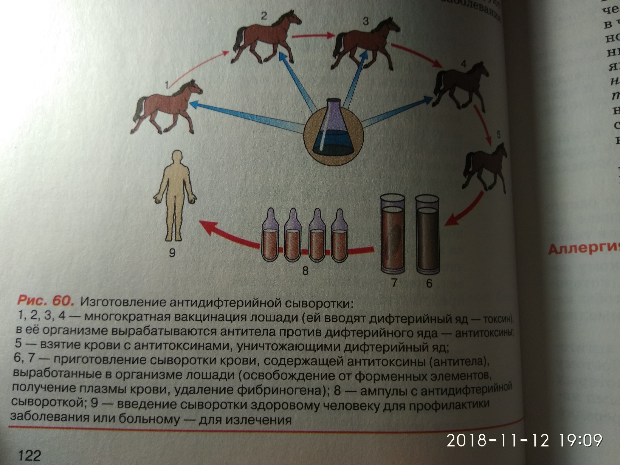 На рисунке 60 показан процесс приготовления противодифтерийного антиоксина, состоящего из антител, нейтрализующих дифтерийный яд. Рассмотрите рисунок и ответьте на вопросы: 1) Что находится в колбе, содержимое которой вводят лошади несколько раз, постепенно увеличивая дозу? 2) Что происходит в организме лошади в ответ на введение этого вещества? 3) Как обрабатывают кровь лошади, чтобы получить антидифтерийный антитоксин? 4) В каких случаях применяют антидифтерийный антитоксин? 5) Какой тип иммунитета вырабатывается у больного, которому ввели антидифтерийный антитоксин?