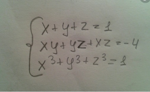 { x + y + z = 1 ; xy +yz +xz = - 4 ; x³+y³+z³= 1 . см .также ПРИЛОЖЕНИЕ