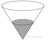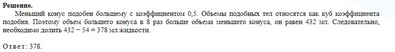 Задача: В сосуде, имеющем форму конуса, уровень жидкости достигает 1/2 высоты. Объём жидкости равен 54 мл. Сколько миллилитров жидкости нужно долить, чтобы полностью наполнить сосуд?