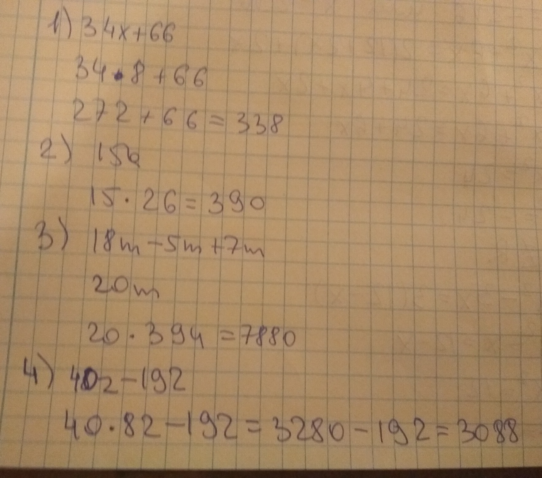 Упростите выражение и найдите его значение: 1) 34х+66,если х=8. 2) 54а-39а,если а=26. 3) 18m-5m+7m,если m=394. 4). 19z-12z+33z-192,если z=82