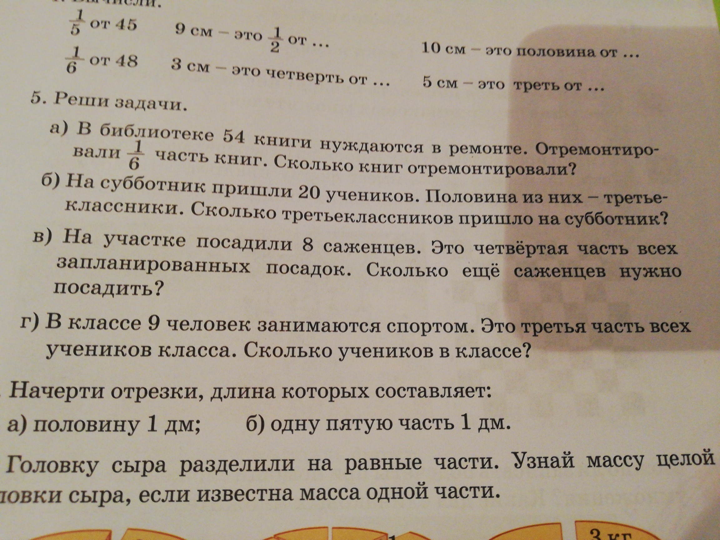 в) посадили 8 сажанцев и это равно 1/4 от всех сажанцев. Значит всего их 4×8=32. А осталось посадить 32-8=24 сажанца.