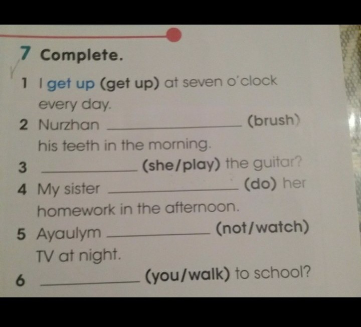 2 brushes 3 Does she play 4 does 5 does not watch 6 Do you walk