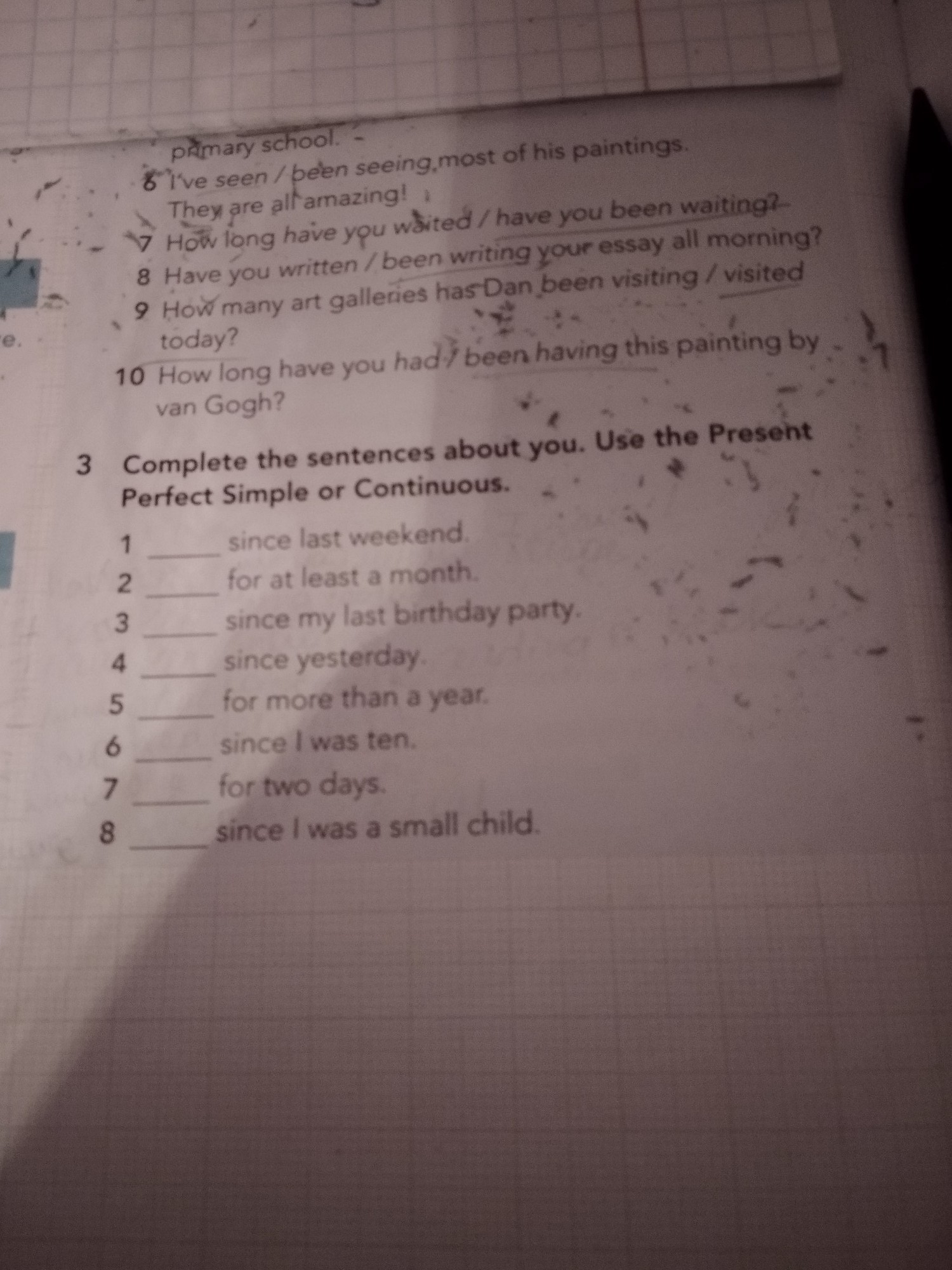 1 I haven't swum 2 I haven't been to school 3 I haven't eaten 4 I haven't played the guitar 5 I haven't worn skirts 6 I haven't eaten pineaple 7 I haven't had a bath 8 I haven't been to the kindergarten