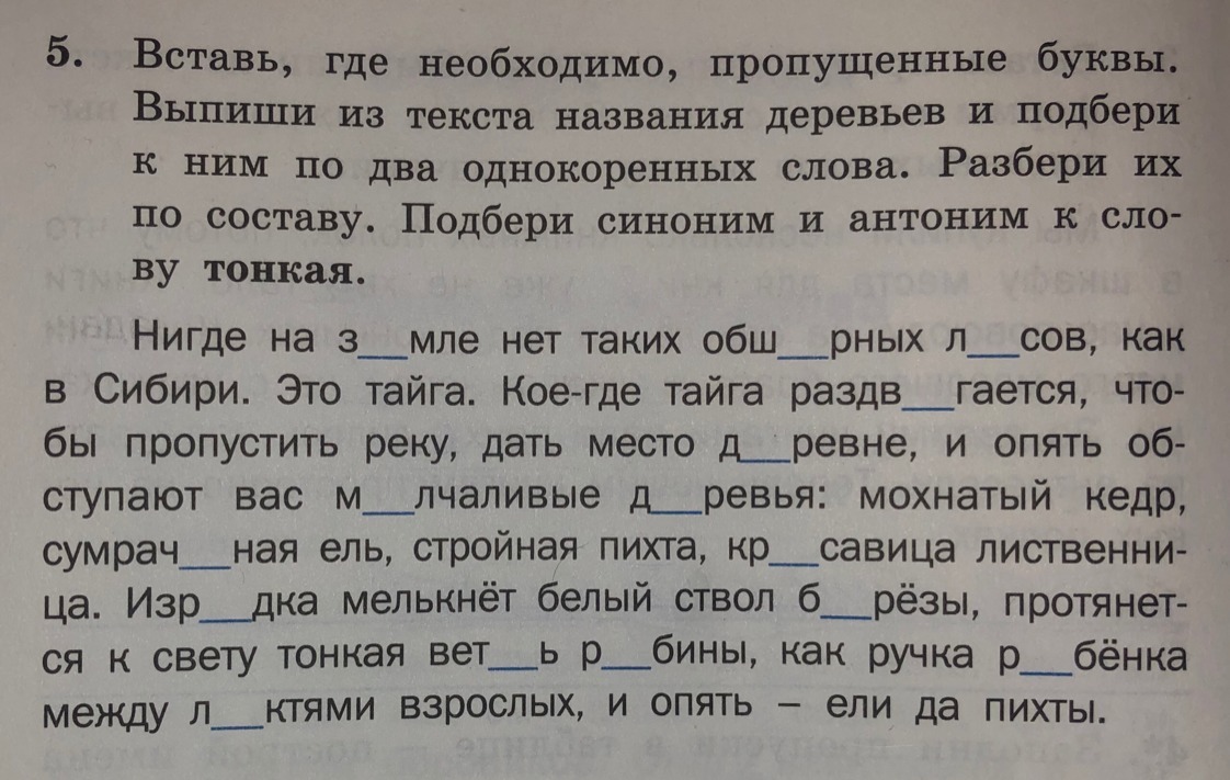 вставь, где необходимо, пропущенные буквы. выпиши из текста названия деревьев и подбери к ним по два однокоренных слова. разбери их по составу. подбери синоним и антоним к слову тонкая.