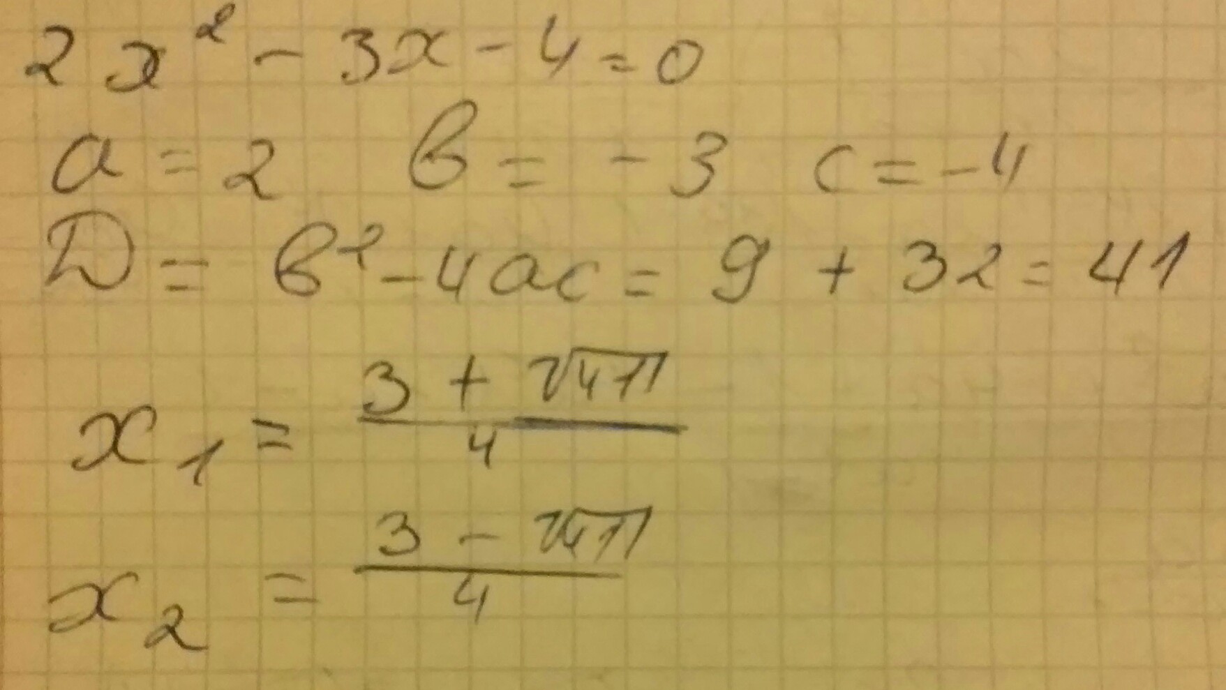 2x^2-3x-4=0 a=2 b=-3 c=-4 D=b^2-4ac= 9+32=41. x1=(3+корень41)/4 x2=(3-корень41)/4