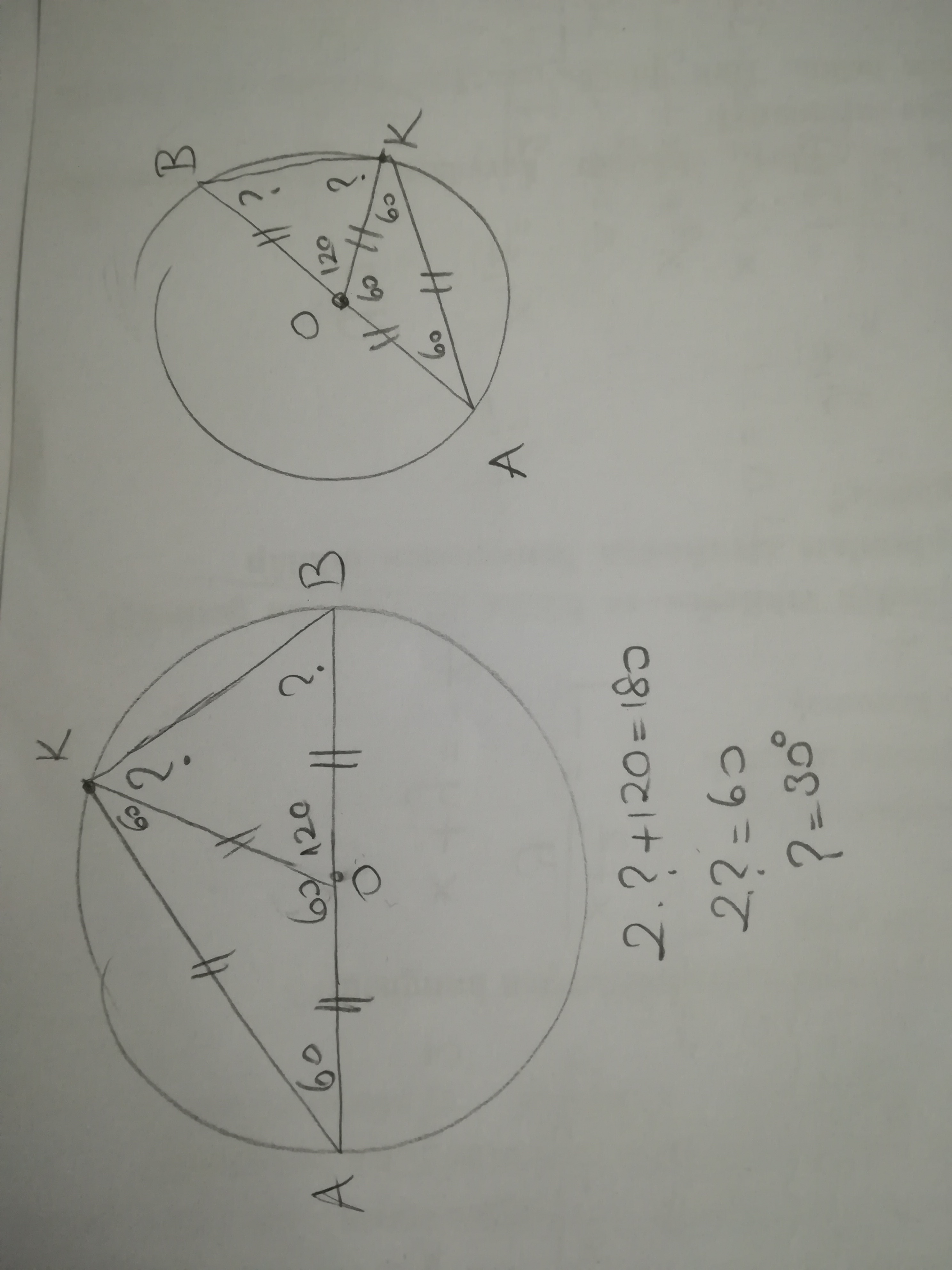 АВ - діаметр кола з центром О, К - деяка точка кола. Знайти величену кута ОКВ, якщо кут АКО = 60°