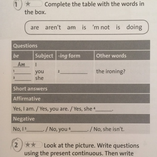 1.are. 2. doing. 3.is. 4.is. 5. 'm not. 6. aren't.