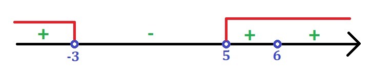 Ответ: (-∞; -3) U (5; 6) U (6; +∞).