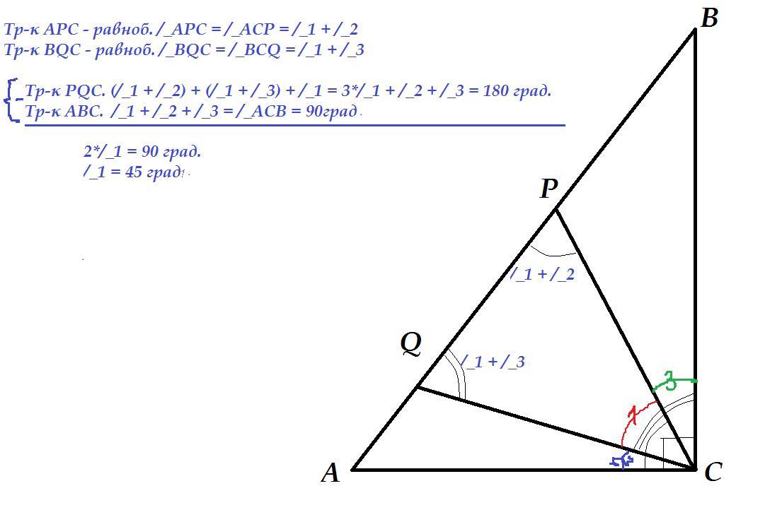 На гипотенузе Ab прямоугольного треугольника Abc выбраны точки P и Q так, что AP=Ac и BQ=BC. Найдите угол PCQ. Ответ дайте в градусах