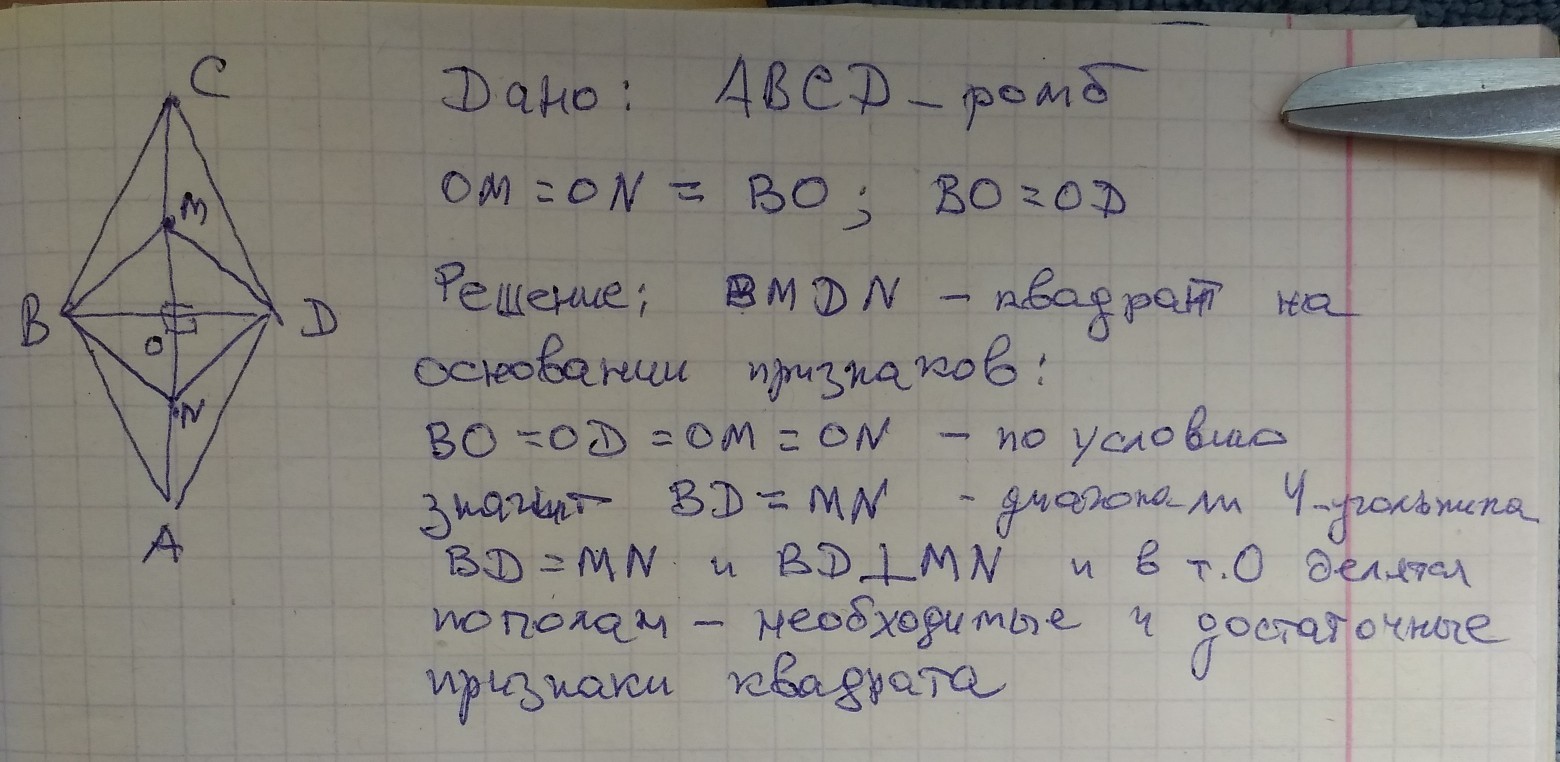 В ромбе АВСD диагонали пересекаются в точке О. На диагонали АС отложены отрезки ОМ и ОN, равные ВО. Определите вид четырёхугольника ВМDN.