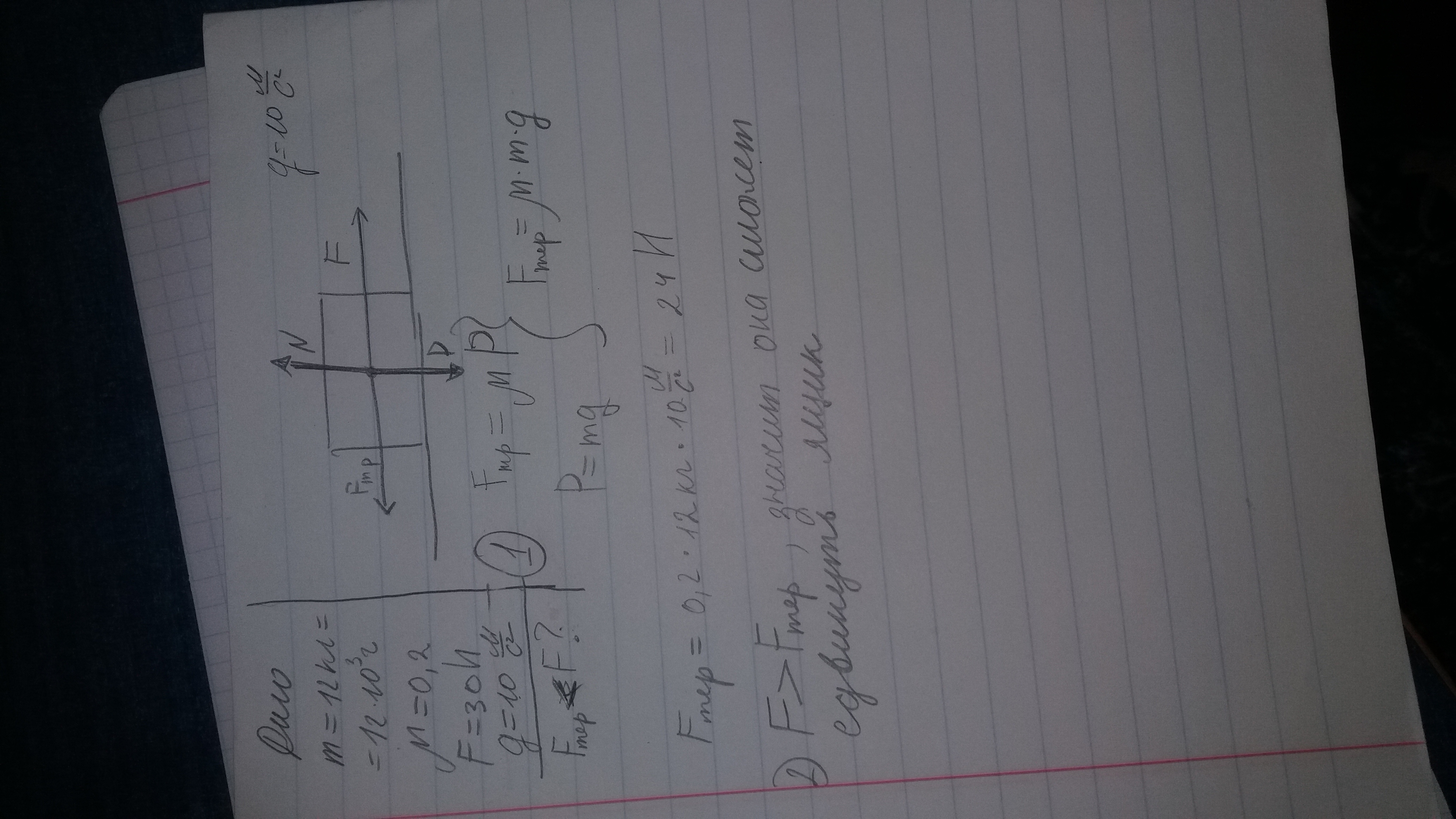 на горизонтальном полу стоит ящик массой 12 кг. Коэффициент трения между полом и ящиком равен 0.2. К ящику в горизонтальном направлении прикладывают силу 30H. Сможет ли приложенная сила сдвинуть ящик?