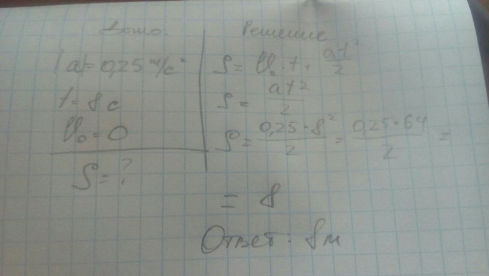Троллейбус начинает двигаться прямолинейно и равно-ускоренно с ускорением, модуль которого а=0,25м/с2. Определите модуль перемещения троллейбуса за за промежуток времени t=8,0С.