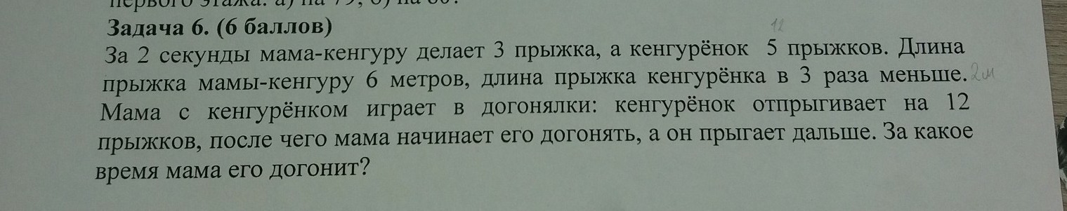 За две секунды мама-кенгуру делает 3 прыжка, то есть отпрыгивает на 9 прыжков кенгурёнка. Значит, за две секунды расстояние между мамой и кенгурёнком сокращается на 4 прыжка кенгурёнка. Между ними было 12 прыжков кенгурёнка, следовательно, маме понадобится 6 секунд, чтобы его догнать.