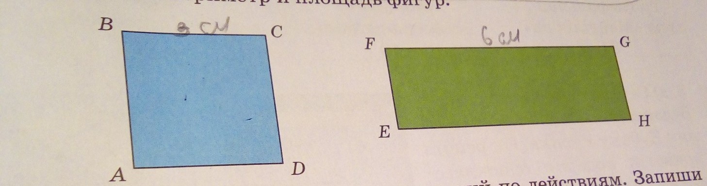 Ответ: периметр квадрата 12 см; площадь квадрата 9 см2; периметр прямоуоольника 16 см; плрщадь прямоугольника 12 см2.