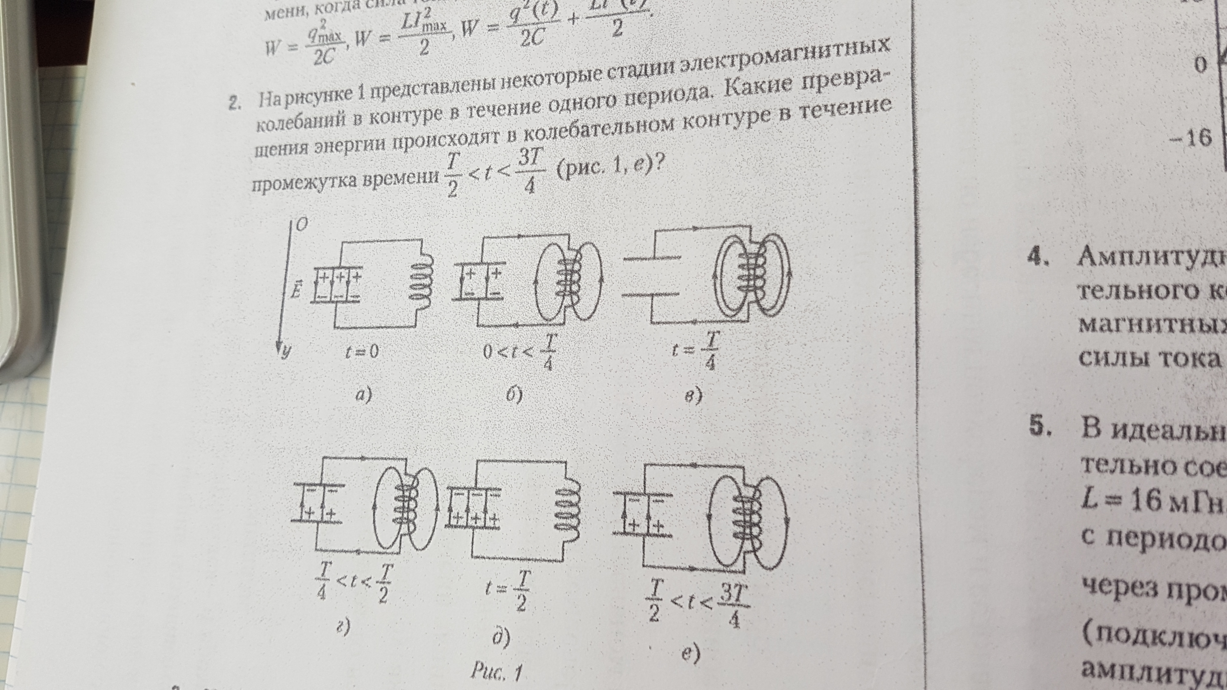 Помогите с заданием! на рисунке 1 представлены некоторые стадии электромагнитных колебаний в контуре в течение одного периода времени. Какие превращения энергии происходят в колебательном контуре в течение промежутка времени T/2