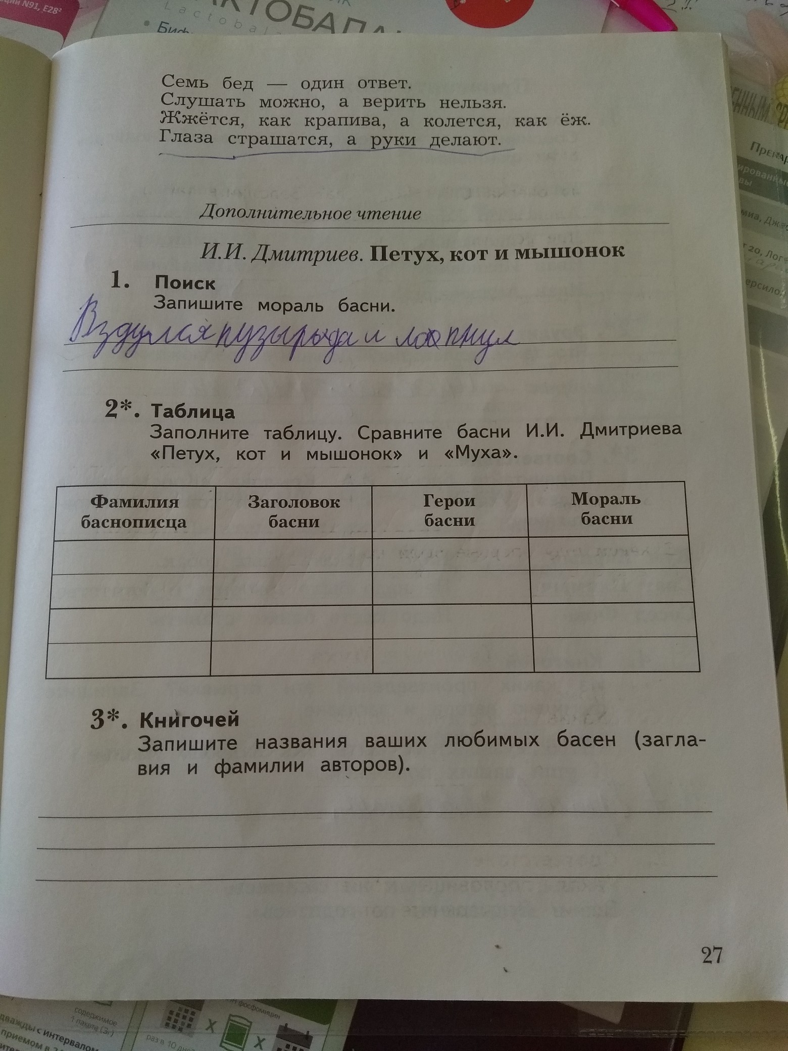 И.И Дмитриев "Муха" Герои: бык,И муха. Мораль басни: муха присвоила труд быка себе, и когда у нее спросили что она делала, она сказала, что они "ПАХАЛИ"