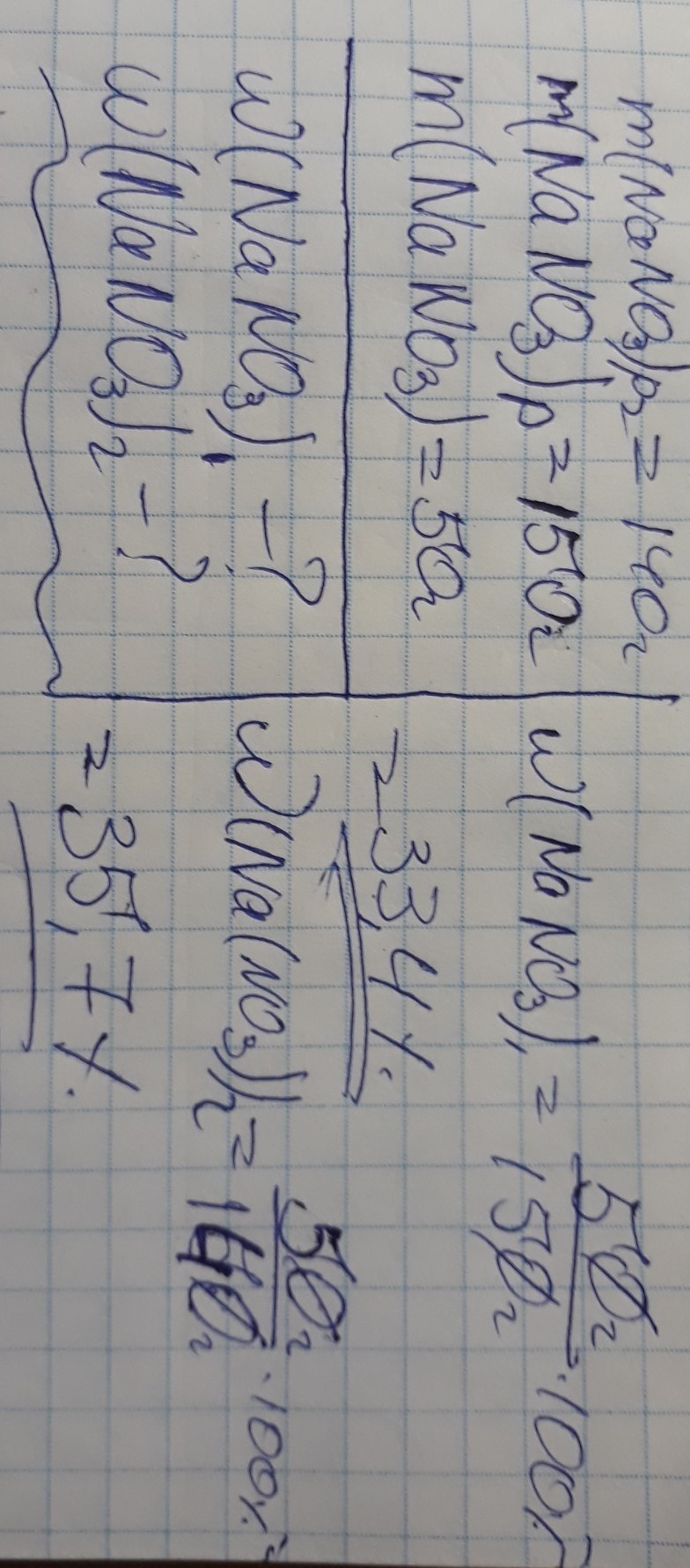 Розчин натрій нітрату масою 150 г містить сіль масою 50г.За нагрівання розчину його маса зменшиться до 140г.Обчисліть масові частки натрій нітрату в розчинні до і після нагрівання