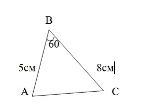 АС =√(5²+8²-2*5*8*cos60)= АС=√(25+64-80*1/2)= АС=√(49)=7