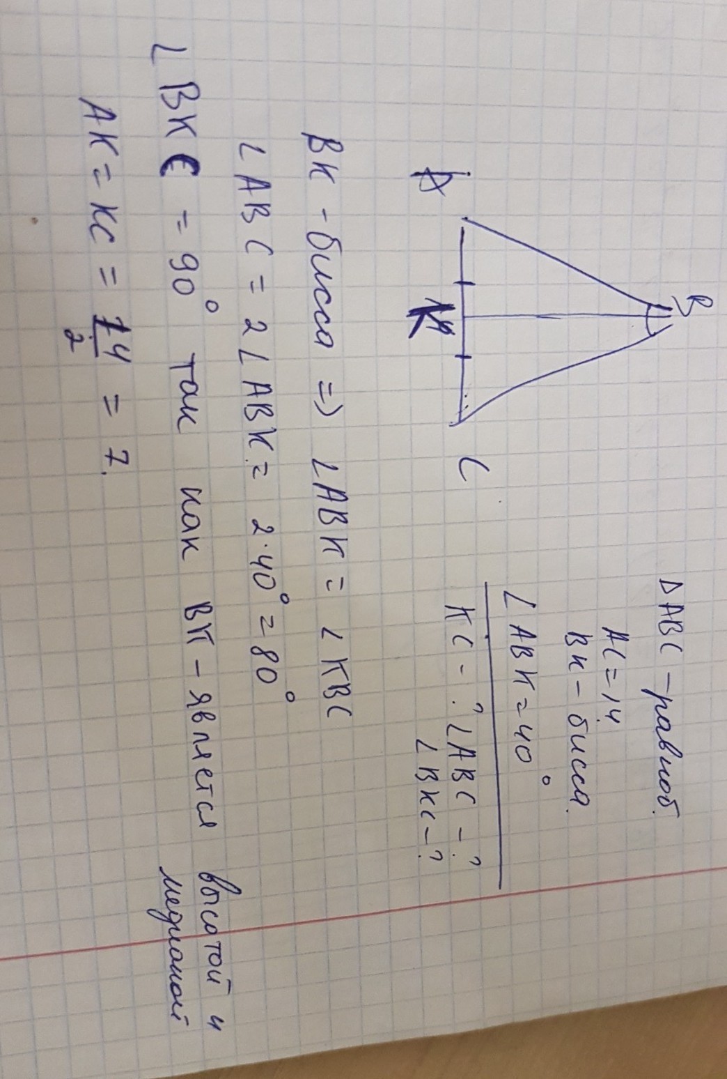 В равнобедренном труегольнике АВС с основанием АС = 14 см отрезок ВК биссектриса, угол АВК равен 40°. Найдите КС, угол АВС, угол ВКС