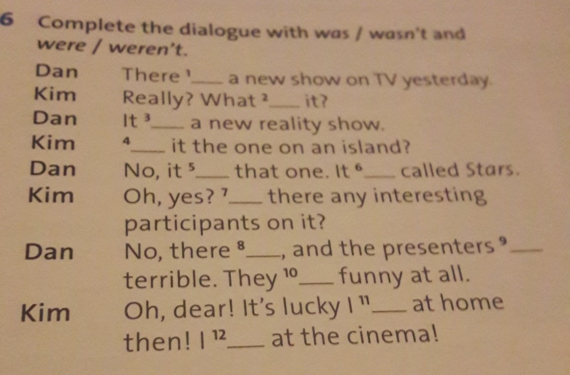 Срочнооооо поЖАЛУЙСТАААААААААcomplete the dialogue with was / wasn't and were / weren't
