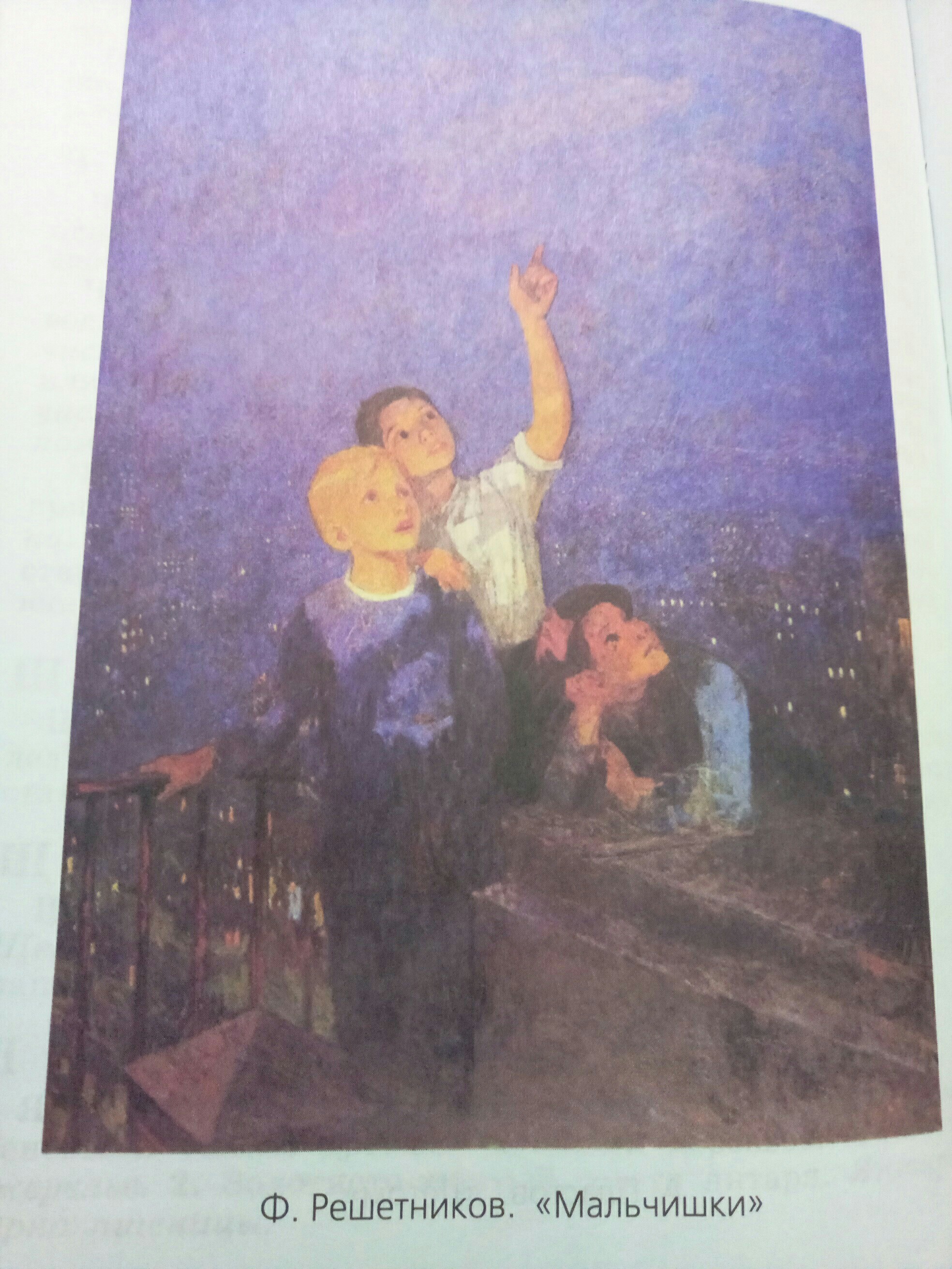 На картине Ф. Решетникова «Мальчишки» изображены три мальчика, которые в тихую летнюю ночь взобрались на крышу дома. Они наблюдают за звёздным небом. Один облокотился на парапет, второй стоит держась за перила, а третий положил руку одному из своих друзей и о чём-то рассказывает, указывая рукой на звёзды. По-видимому, он очень увлечен астрономией. Может быть, он рассказывает о созвездиях или о том, есть ли жизнь на других планетах. Другому мальчику интересен его рассказ, и он с заинтересованным лицом смотрит на небо. А третий их товарищ о чём то мечтает. Его лицо спокойно и задумчиво.