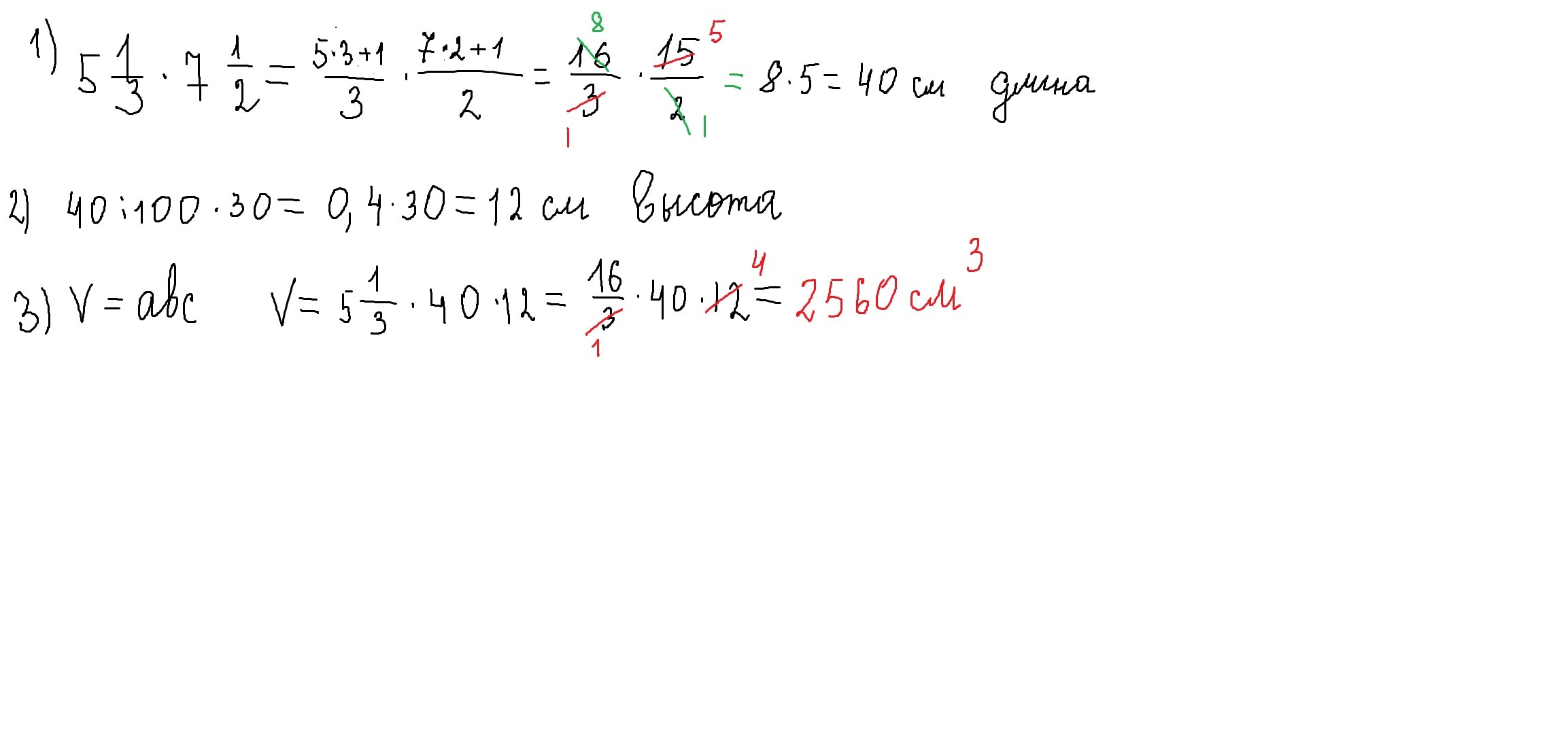 объем=40 * 5 1/3 * 12 = 40 * 16/3 * 12 = (40 * 16 * 12)/3 = 40 * 16 * 4 = 2560 (см3).