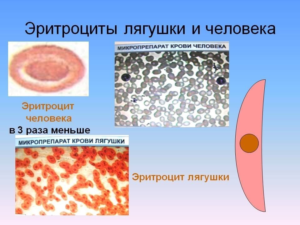 отличие эритроцитов лошади и человека в том что эритроциты лошади в 3 раза крупнее человеческих а лягушачьи в 3 раза меньше человека
