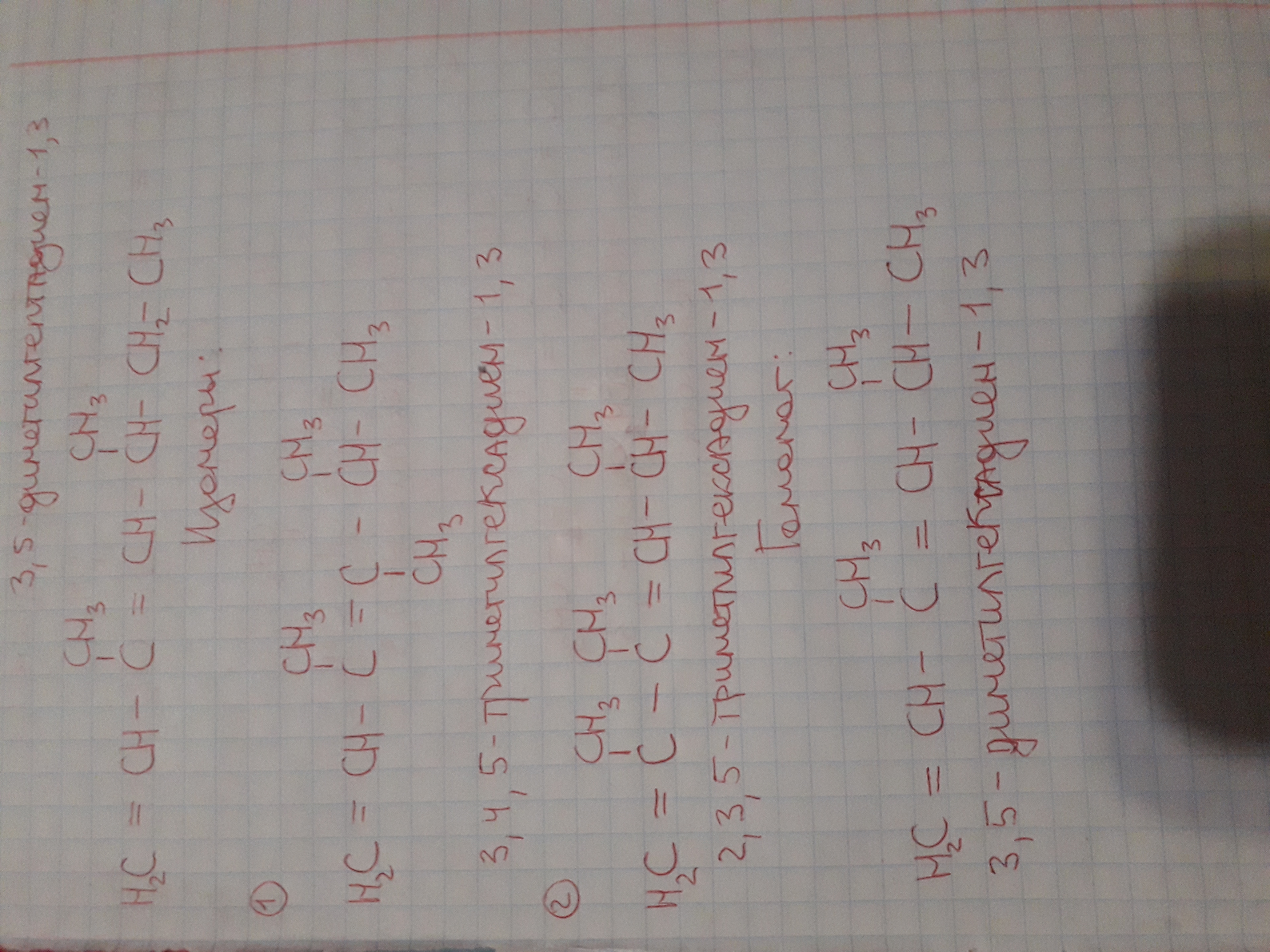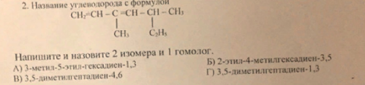 Помогите пожалуйста! Необходимо составить 2 изомера и 1 гомолог. Я так понимаю это Г) 3,5-диметилгептадиен-1,3 Нужно составить изомеры и гомолог. Буду очень благодарен!
