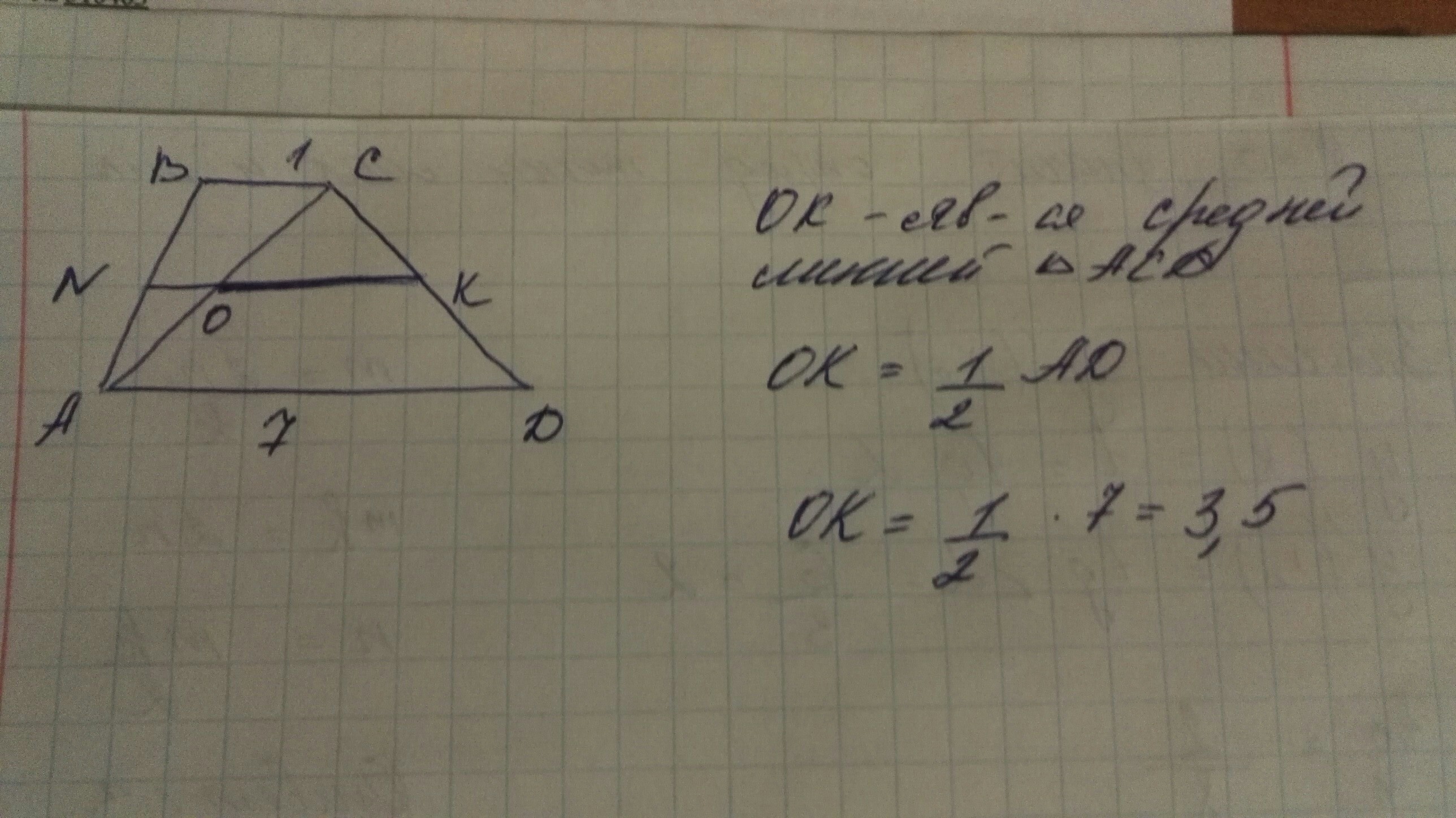 Основание трапеции равны 1 и 7, найти больший из отрезков,на которые делит среднюю линию этой трапеции одна из её диагоналей?