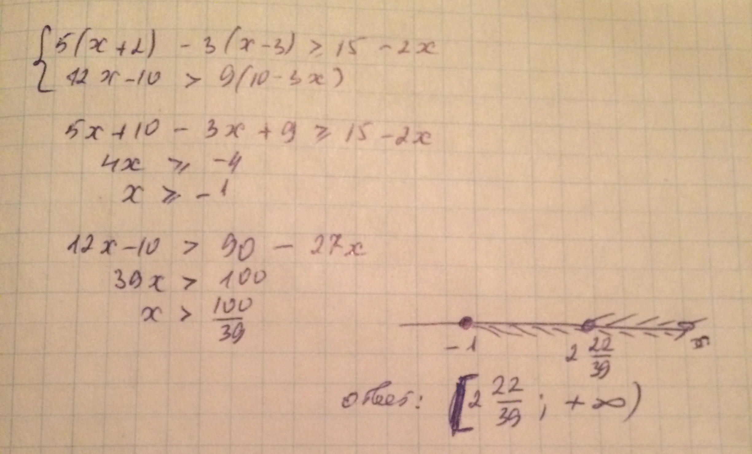 решаем первое неравенство, затем второе. отмечаем решение на координатной прямой. Наш х совпадает для обоих неравенств на промежутке от 100/39 до + бесконечности. (обе точки закрашены