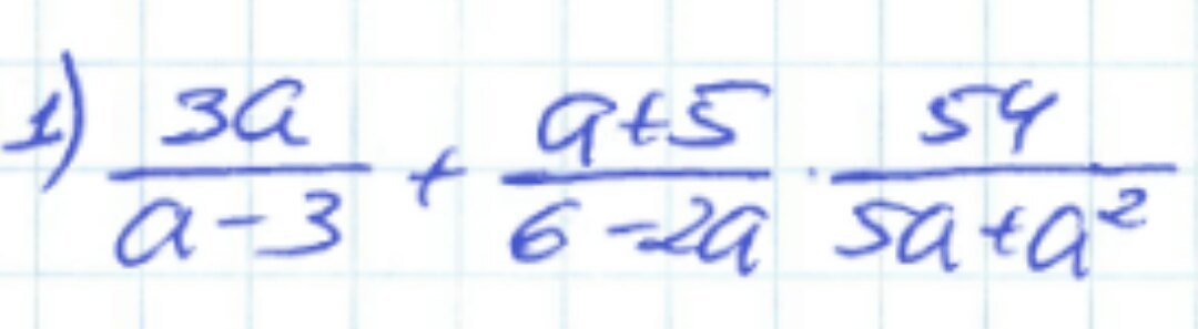 frac{3a}{a - 3}  +  frac{a + 5}{6 - 2a} times  frac{54}{5a +  {a}^{2} }  = frac{3a}{a - 3}  +  frac{a + 5}{2(3 - a)} times  frac{54}{a(5 + a) } = frac{3a}{a - 3} + frac{27}{a(3 - a)}  = frac{3a}{a - 3}  -  frac{27}{a(a - 3)}  =  frac{3 {a}^{2} - 27 }{a(a - 3)}  =  frac{3(a - 3)(a + 3)}{a(a - 3)}  = frac{3a + 9}{a}