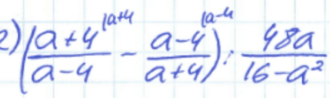 ( frac{a + 4}{a - 4}  -  frac{a - 4}{a + 4} ) div  frac{48a}{16 -  {a}^{2} }  =  frac{ {(a + 4)}^{2} -  {(a - 4)}^{2}  }{(a - 4)(a + 4)}  times  frac{16 -  {a}^{2} }{48a}  =  frac{ - 16a}{16 -  {a}^{2} }  times  frac{16 -  {a}^{2} }{48a}  =  -  frac{1}{3}