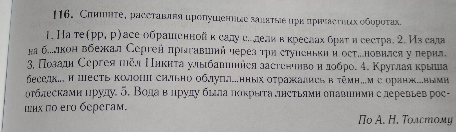 1) Террасе,2)сидели,3)балкон,4)остановился 5)беседке,6) облупленных,7)тёмном,8) оранжевыми.