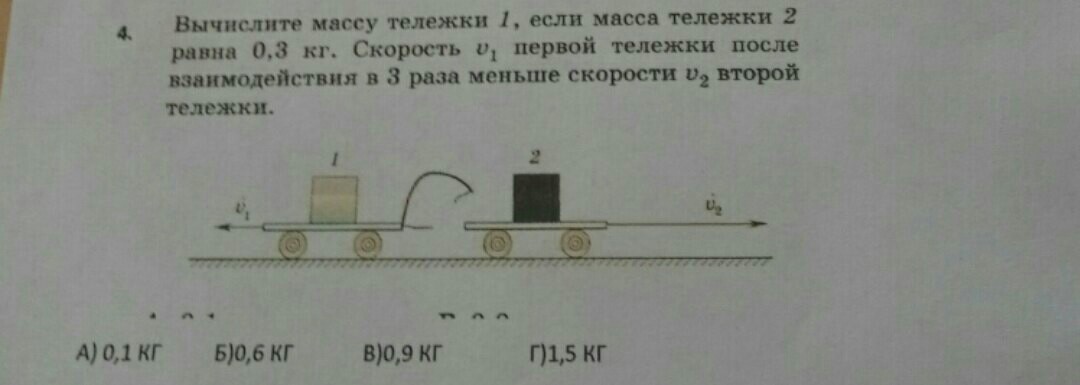 Как мы знаем у тела имеющего меньшую скорость при одинаковых условиях масса больше, значит у 1 тележки масса больше в 3 раза, т.е 0.9 кг. Ответ В