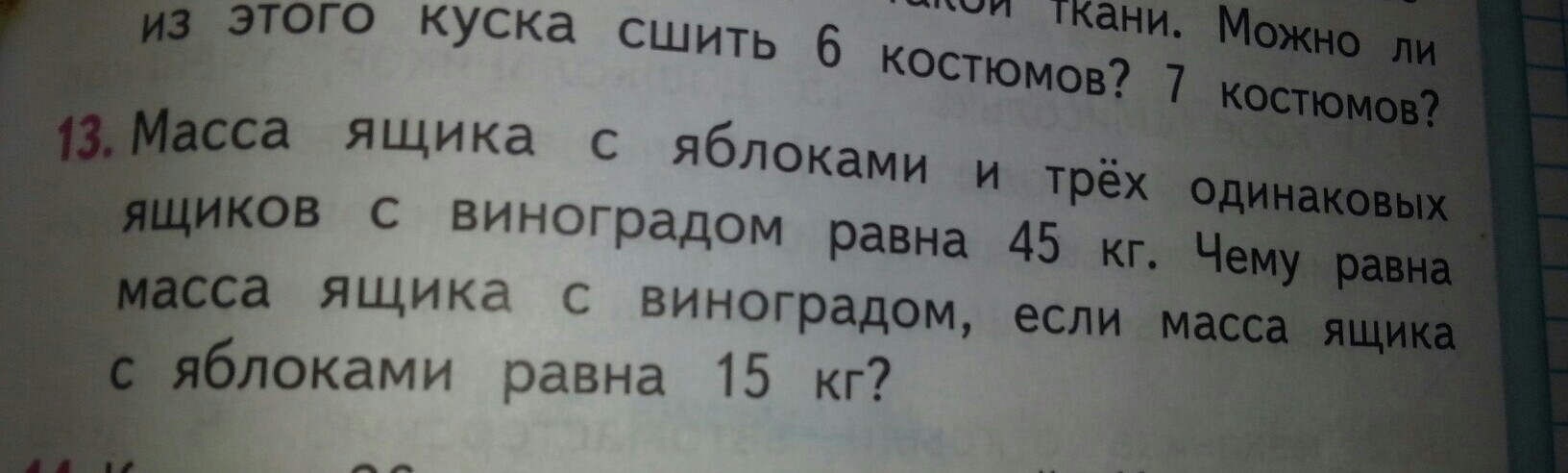 масса ящикас яблоками и трех одинаковых ящиков с виноградом равна 45кг. написать краткую запись