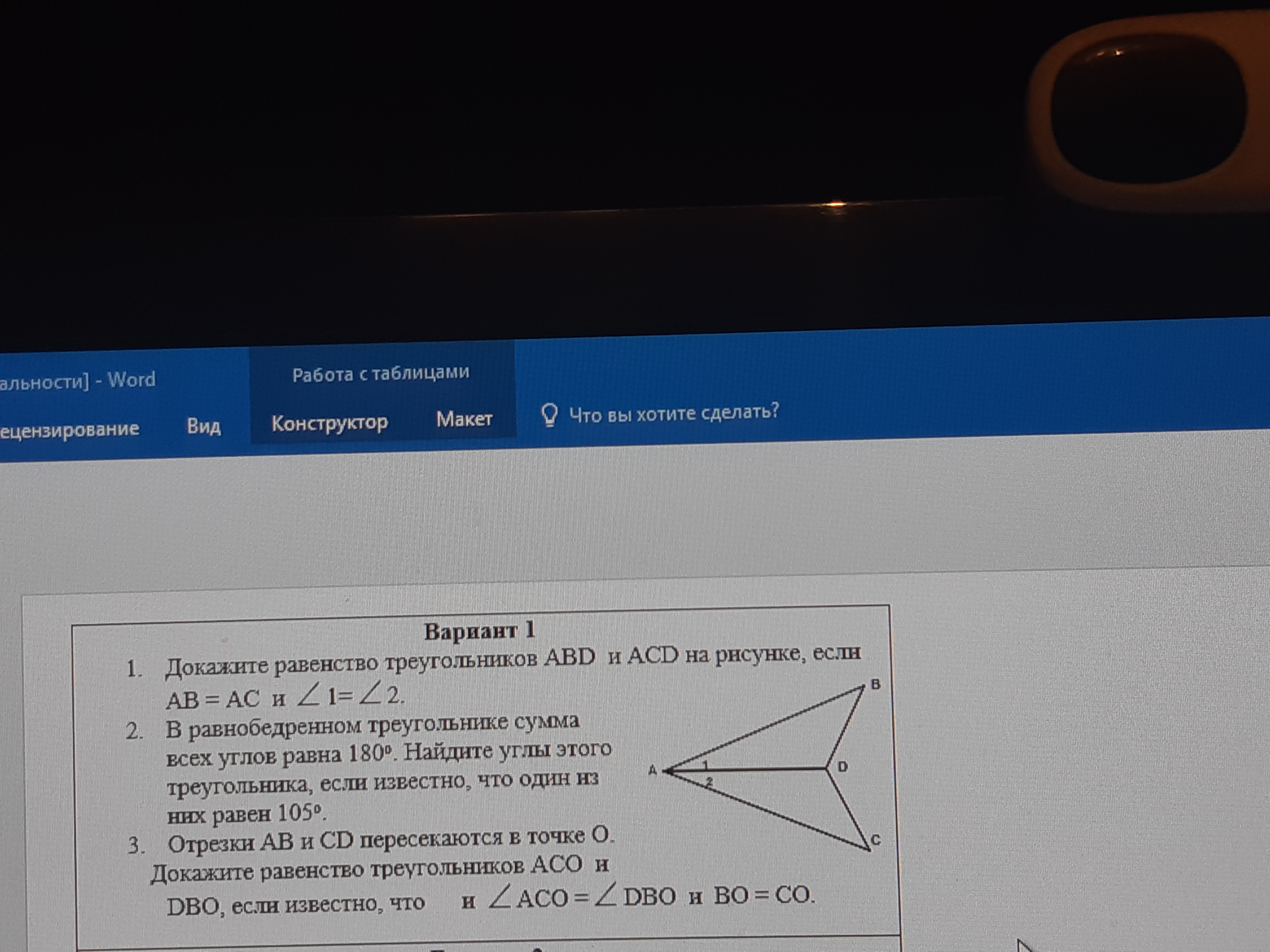 1) АВ=АС по условию, 1=2 по условию, АD- общая. Значит, треугольники равны по 1 признаку рав-ва треугольников.