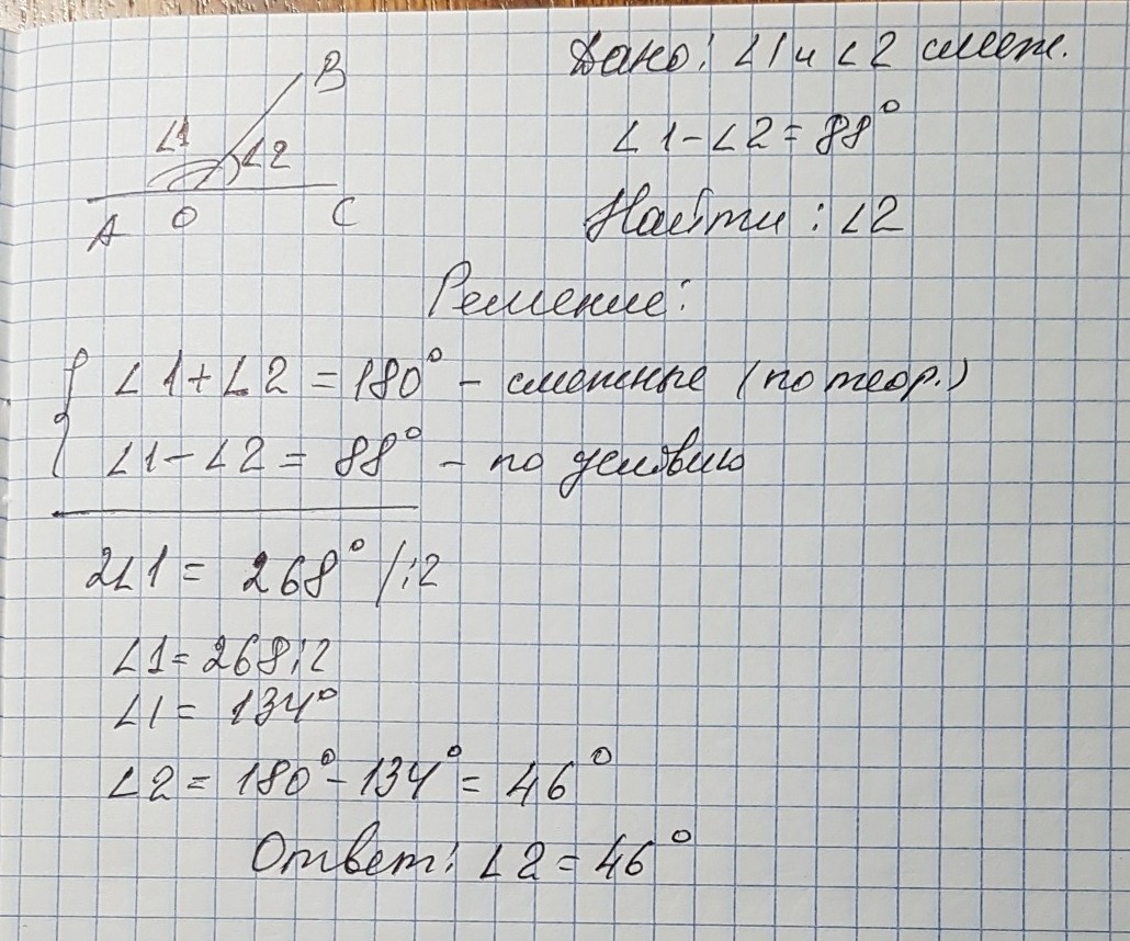 Разность двух смежных углов равна 88 градусов . Найдите меньший из этих углов помогите плиз