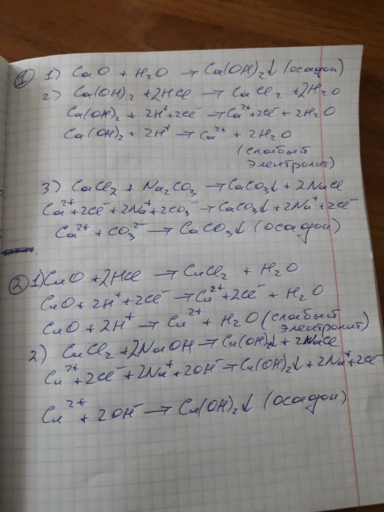 Осуществите превращения: CaO > Ca(OH)2 > CaCl2 > CaCO3 CuO > CuCl2 > Cu(OH)2 Составьте уравнения реакций в молекулярной, полной и сокращенной ионной формах, отметьте признаки каждой из них.