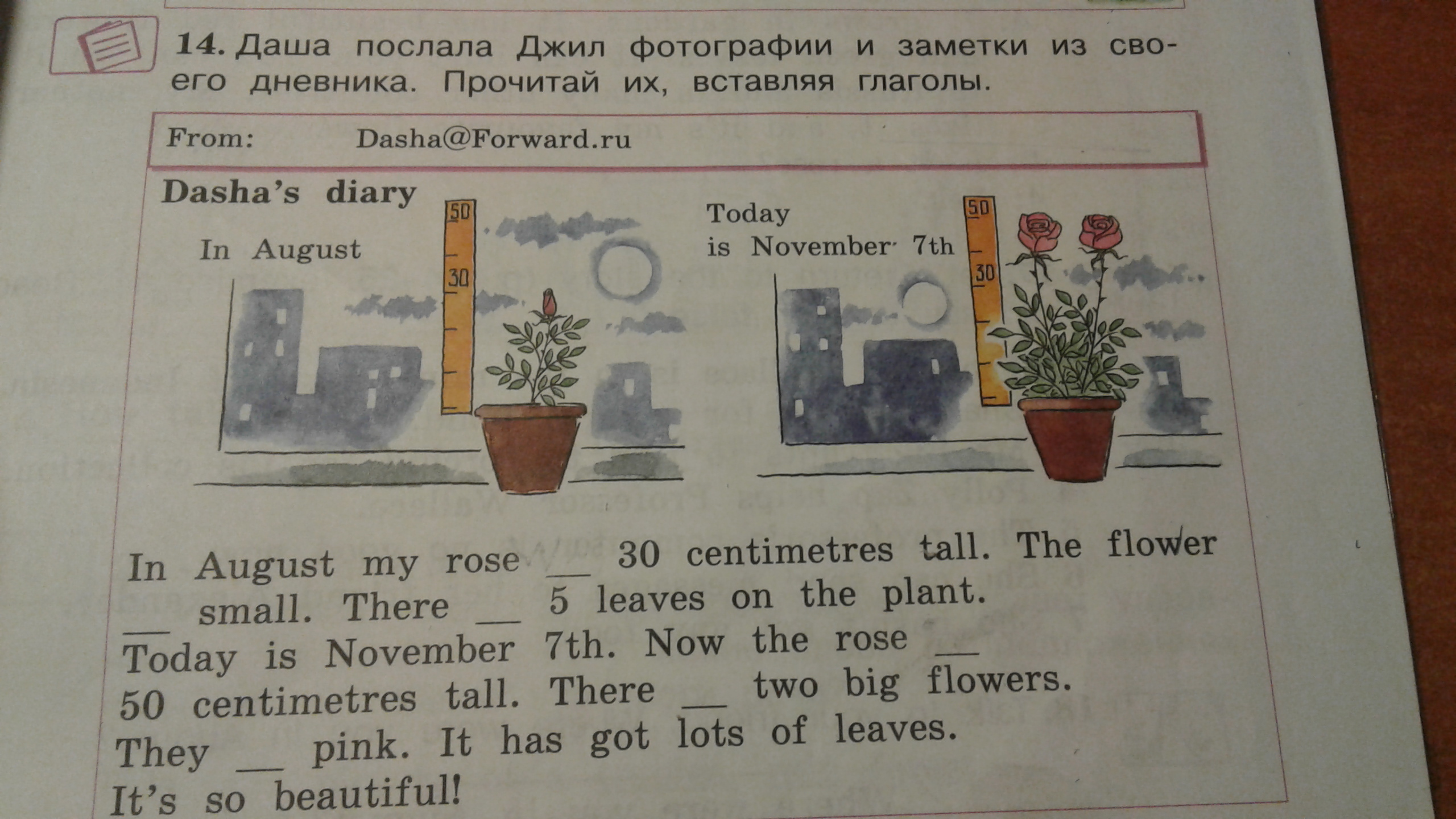 В августе моя роза имела размер 30 сантиметров в длину. Растение маленькое. Всего 5 листьев на растении. Сегодня 7 ноября. Сейчас роза имеет длину 50 сантиметров. Она имеет 2 больших цветка. Они розовые. Оно имеет очень много листьев. Это так красиво!