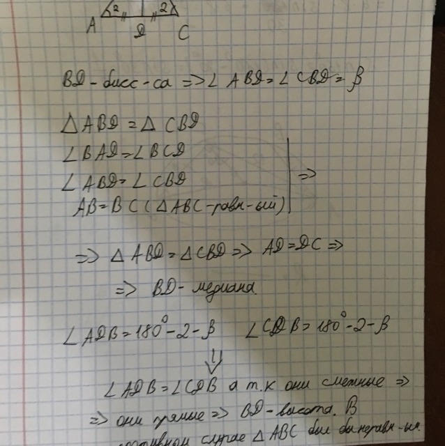 доказать теорему: в равнобедренном треугольнике биссектриса проведенная к основанию является медианой и высотой(НЕ КАК В ИНТЕРНЕТЕ)