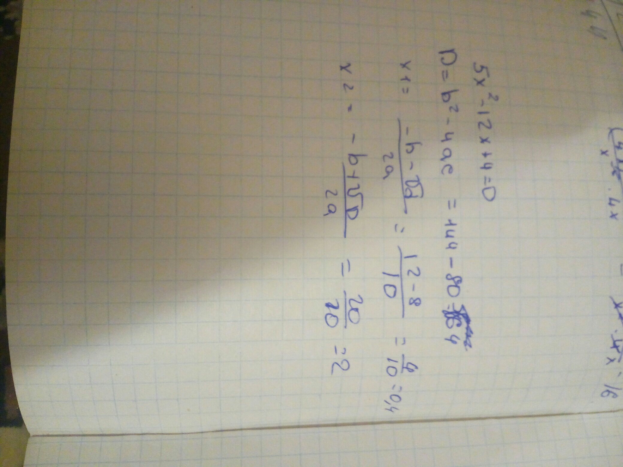 D=(-12)^2-4*5*4=144-80=64; x1=(12-8)/10, x2=(12+8)/10. x1=0,4. x2=2. Ответ: x=0,4. x2=2.
