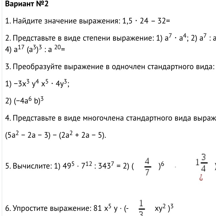 1)-3х³у⁴х⁵×4у³ = -12ч³+⁵у⁴+³ = -12х⁸у⁷