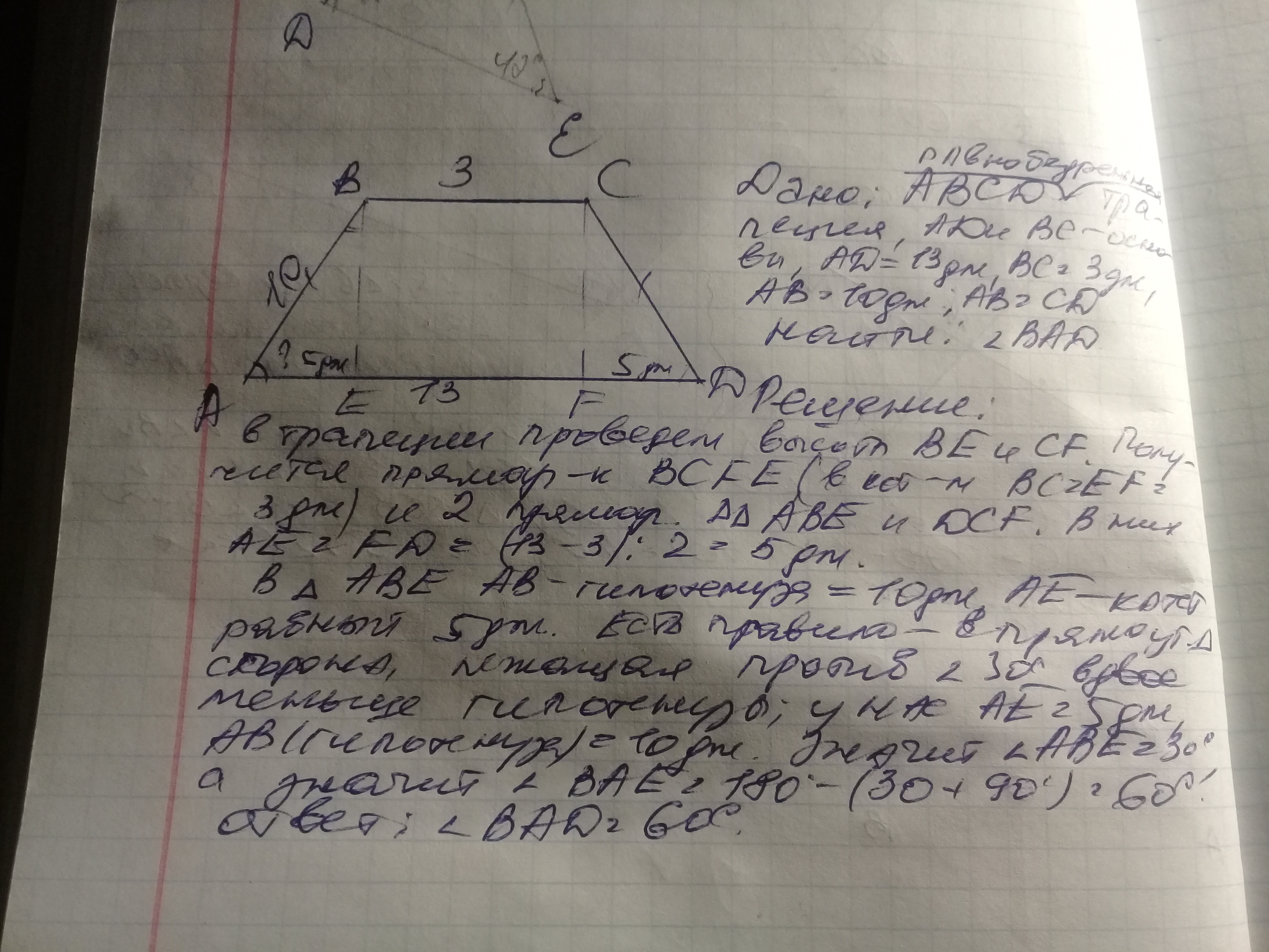 В равнобедренной трапеции ABCD AD и BC - основы, AD=13 дм, BC=3 дм, AB = 10 дм. Найдите величину угла BAD.