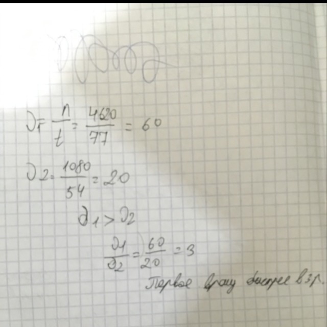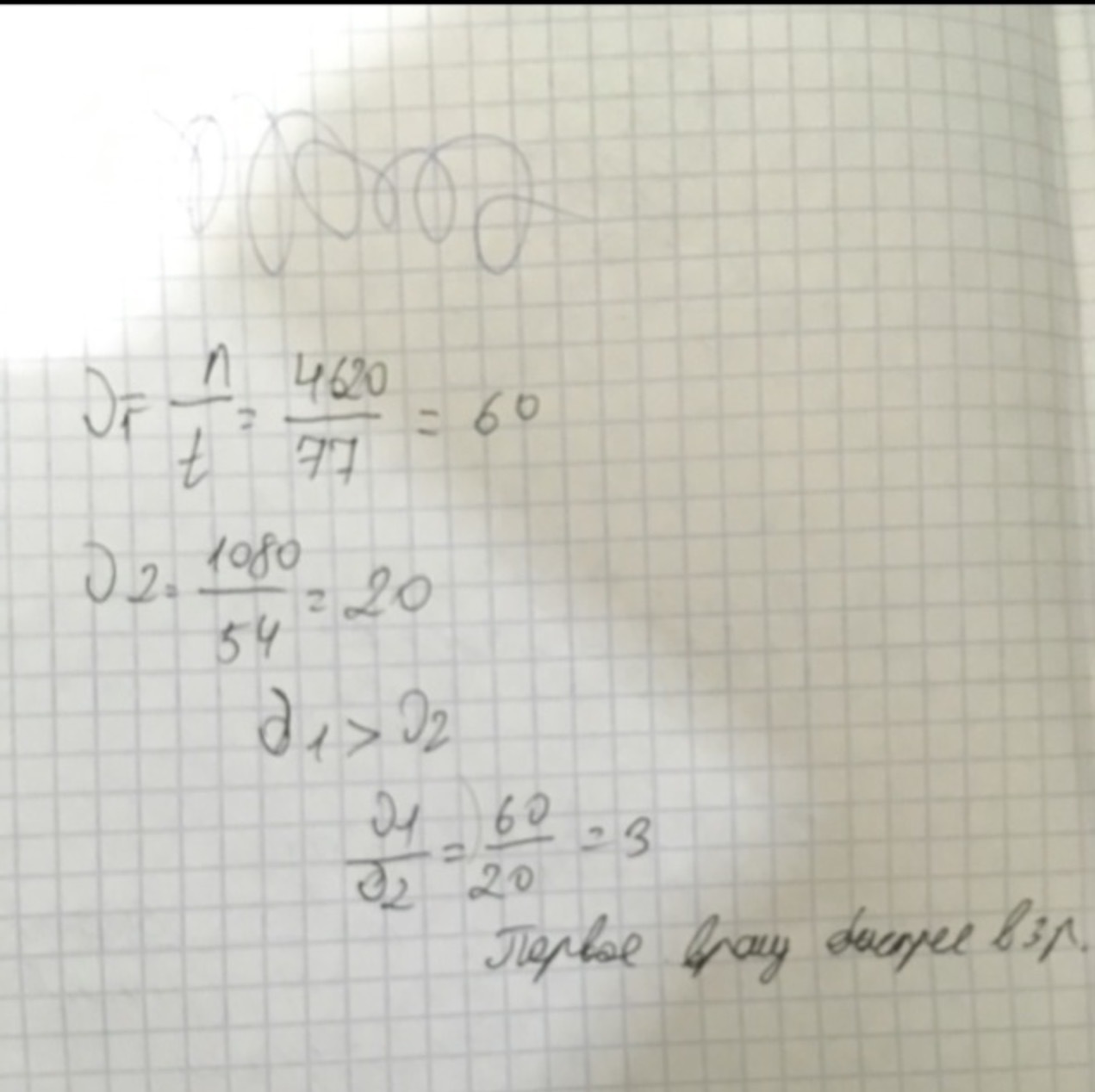 Одно колесо делает 4620 оборотов за 77 мин, а другое 1080 оборотов за 54 мин.Какое колесо вращается быстрее и во сколько раз?