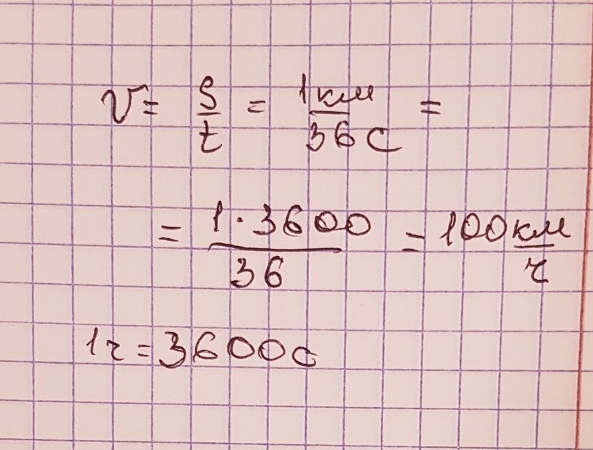 Расстояние между двумя столбами 1 км поезд проехал за 36 секунд. Выразить скорость поезда в км/ч