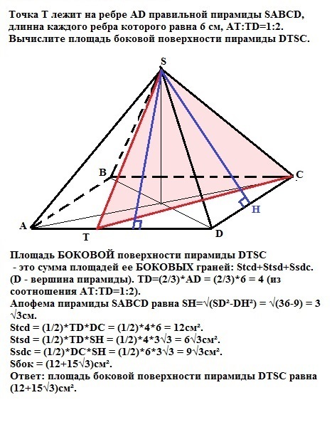 Точка T лежит на ребре AD правильной пирамиды SABCD, длинна каждого ребра которого равна 6 см, AT:TD=1:2. Вычислите площадь боковой поверхности пирамиды DTSC.